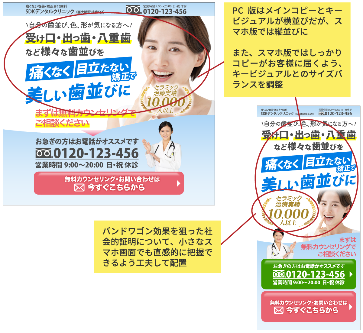 特にスマートフォンでは、小さい画面での確認となるため、コピーがしっかり伝わることを重視してデザインしています。