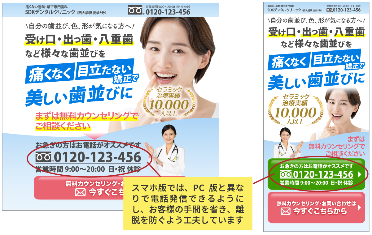 スマホでLPを閲覧したお客様はそのままワンタップで問い合わせすることができ、離脱を防ぐための工夫をしています。