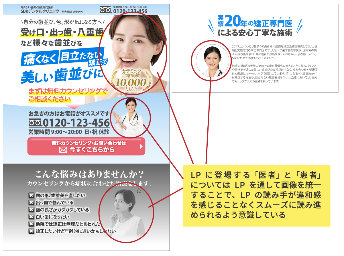 LPに登場する「医者」と「患者」については、LPを通して画像を統一することで、LPの読み手が違和感を感じることなくスムーズに読み進められるよう意識してデザインしています。