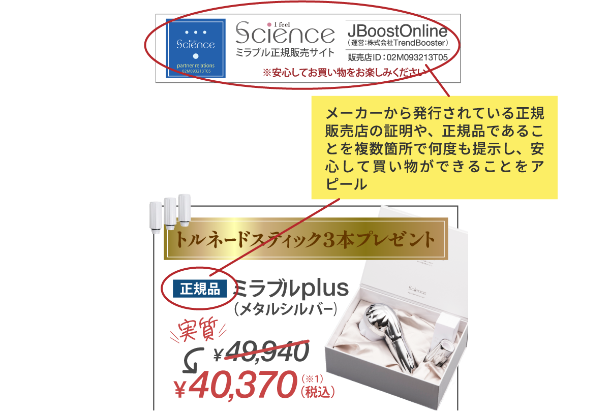 実は、この商品はテレビニュースなどでも取り上げられましたが、各ECモールにて粗悪な偽物が出回っています。そこで、ファーストビュー・CTAエリアなどで繰り返し正規販売店であることを伝え、お客様の不安を取り除き、安心して買い物をしていただけるよう配慮しています。
