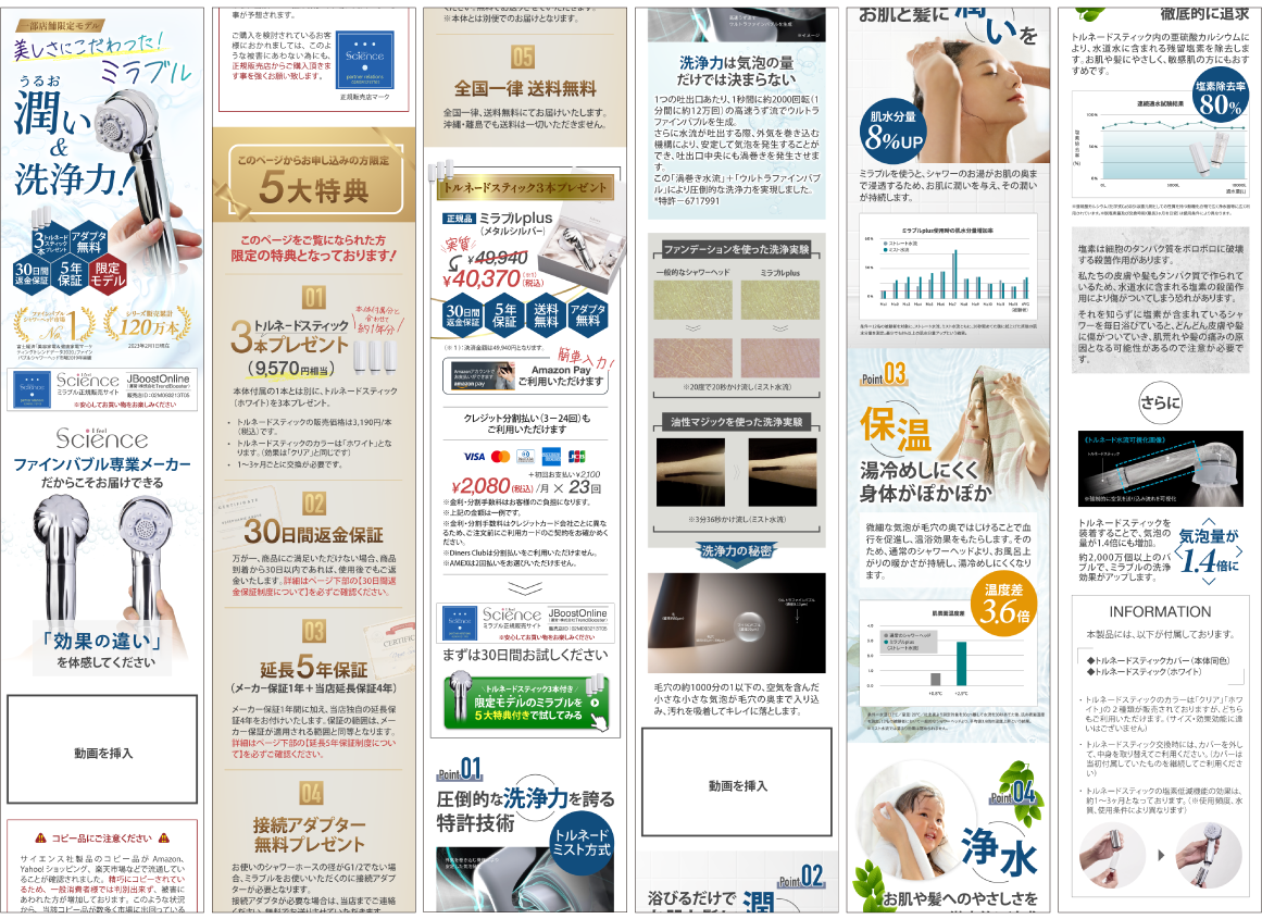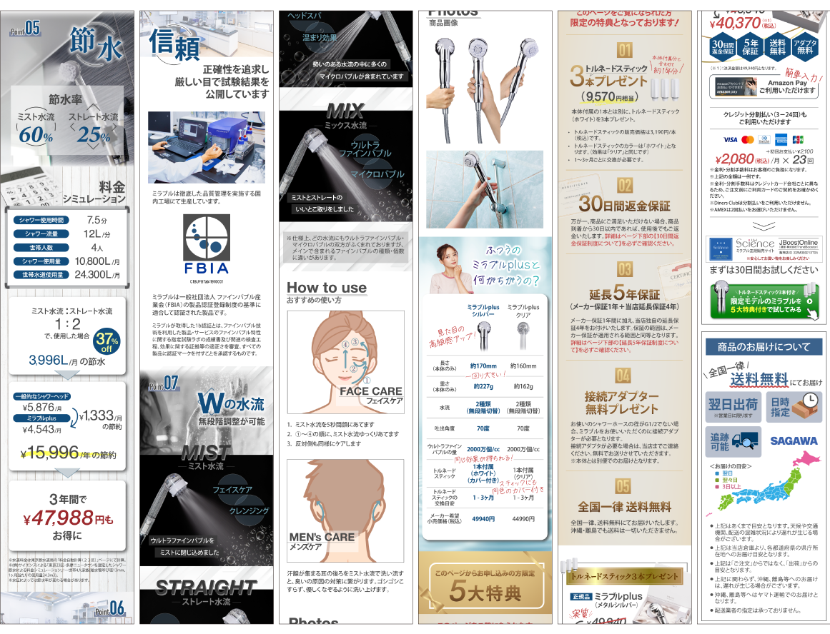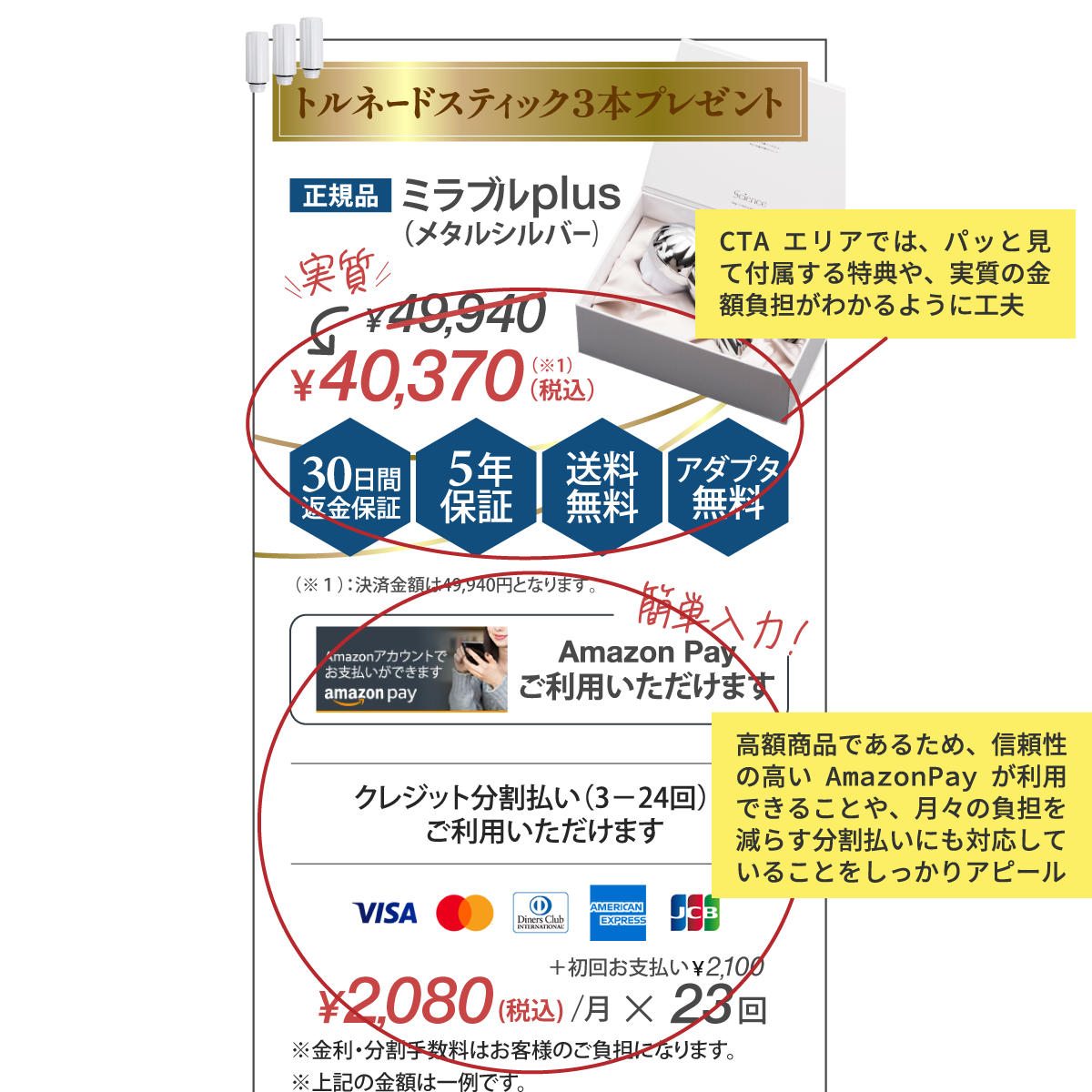 - 高額な商品であるため、金額に関する不安があるユーザーのために、分割決済も可能であること、またその具体的な金額例を提示し、月々の負担はそれほど大きくなく購入できることをアピール。