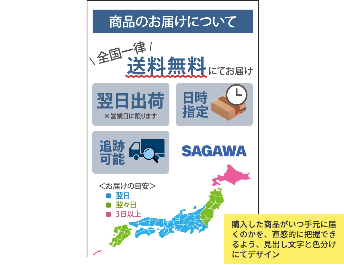 通常、物販のECサイトでは「お買い物ガイド」などにまとめられがちな商品のお届けに関する内容を、あえてLP内にも配置しました。