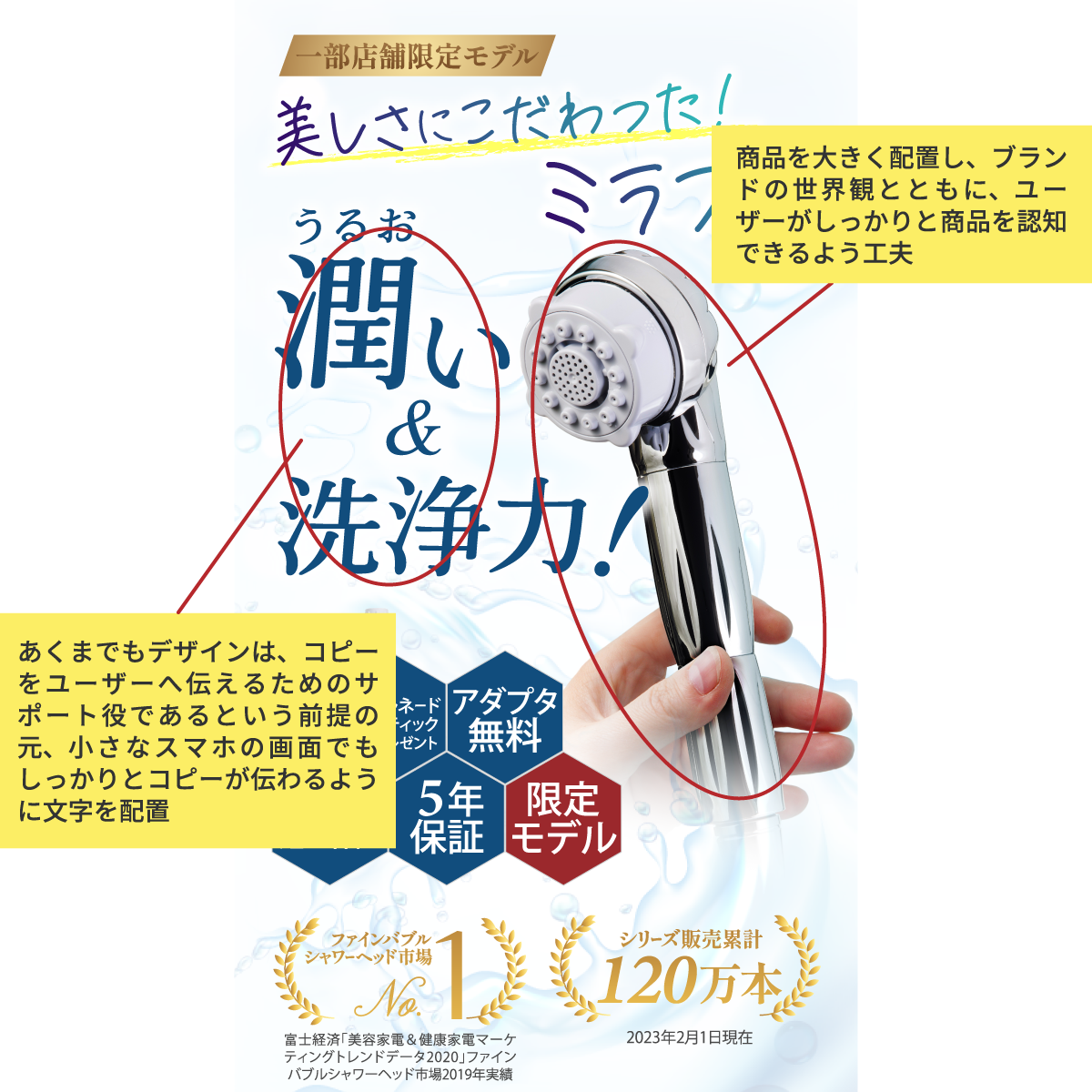 一般的に人は、とあるページを閲覧したときに「3秒」でその先を読み進めるか、離脱するかを決めると言われています。そのため、小さなスマホの画面でもコピーの可読性が高く、販売する商品を明確に把握できることを意識してデザインしています。